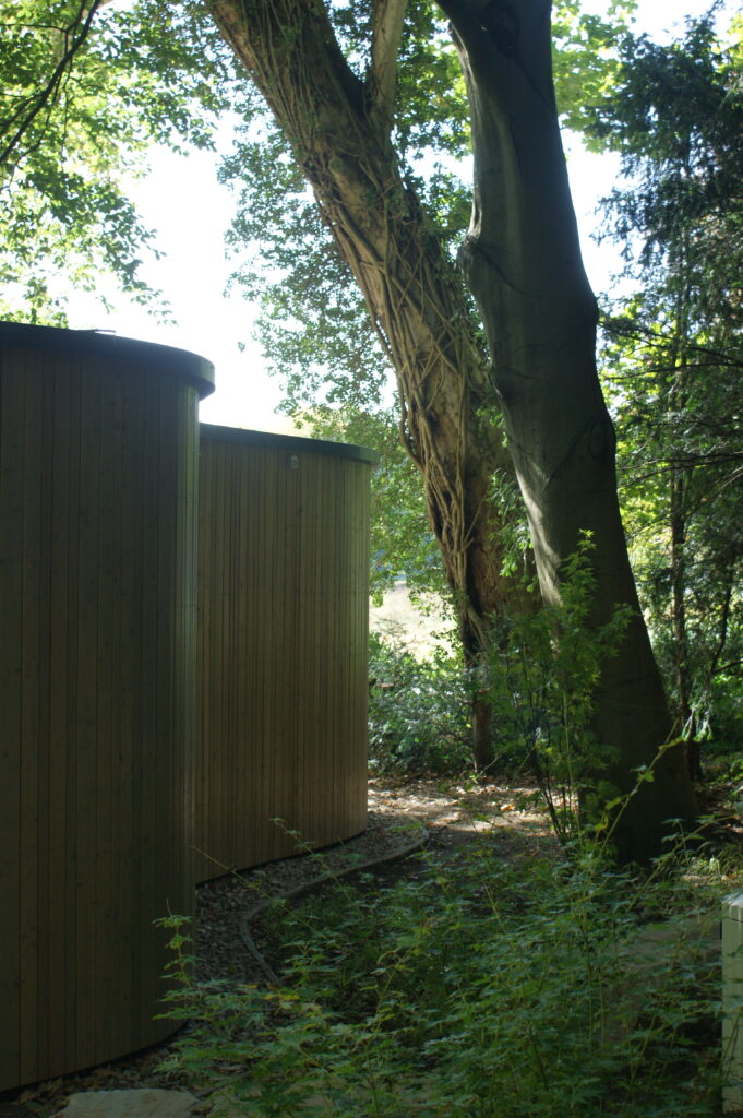respektiert den Jahrhunderte alten Baumbestand, er fügt sich mit der Wahl der Materialien harmonisch in das natürliche Umfeld ein.